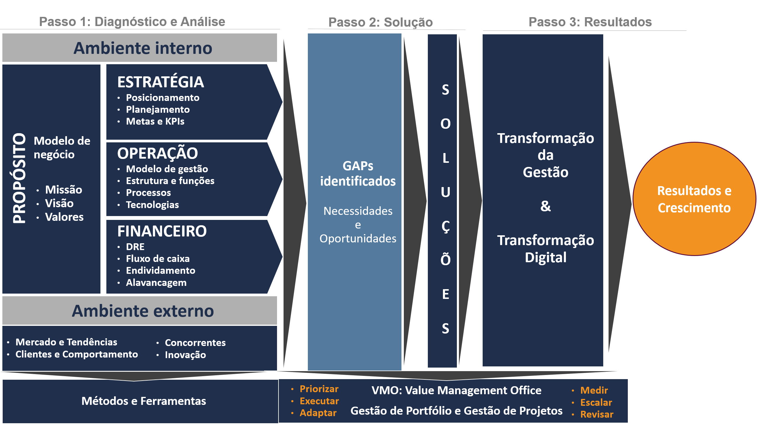 Nosso método é baseado em uma abordagem personalizada e colaborativa, focada em resultados sustentáveis e crescimento contínuo. Atuamos lado a lado com nossos clientes, aplicando metodologias consagradas que integram estratégia de negócio, transformação digital e gestão empresarial.